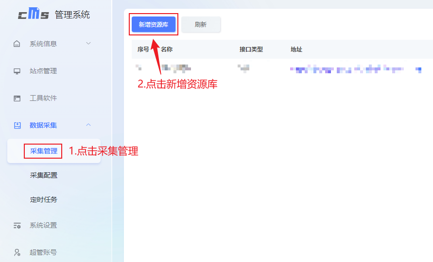 然后点击左侧菜单的“数据采集”展开菜单并点击“采集管理”,打开采集管理后再点击“新增资源库”。