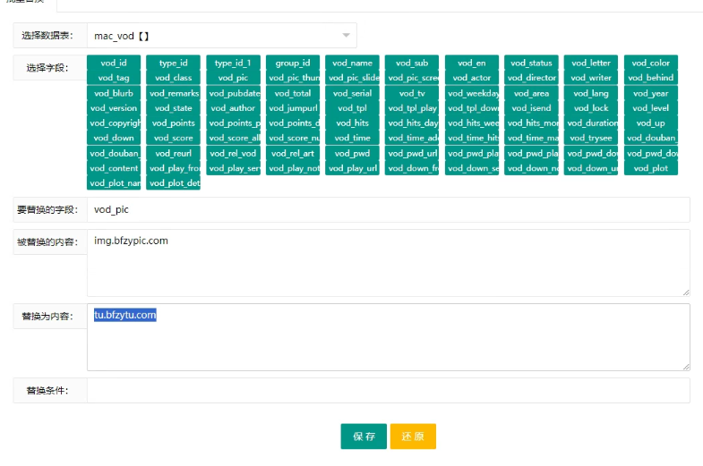从数据库字段,选择【vod_play_url】后 要替换的字段框内会自动填写 【vod_play_url】